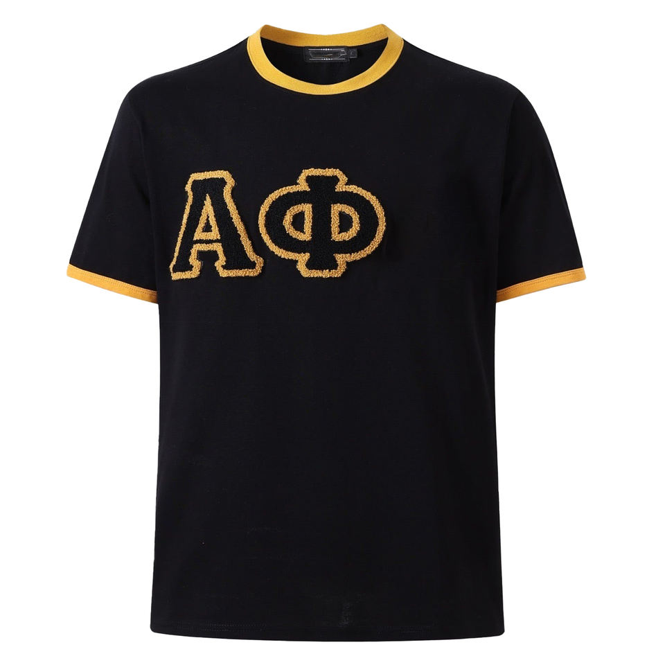Alpha Phi | T-shirt Ringer Premium de la Fraternité ΑΦΑ - T-shirt noir et or vieilli avec lettres en chenille Alpha, t-shirt de sororité