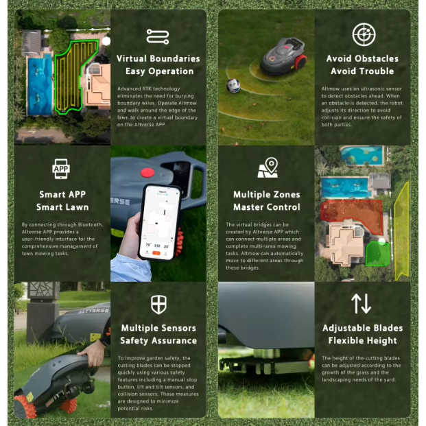Tondeuse à gazon robotisée Altorse, navigation RTK, évitement d'obstacles par IA, contrôle intelligent par application, zones multiples, lames réglables
