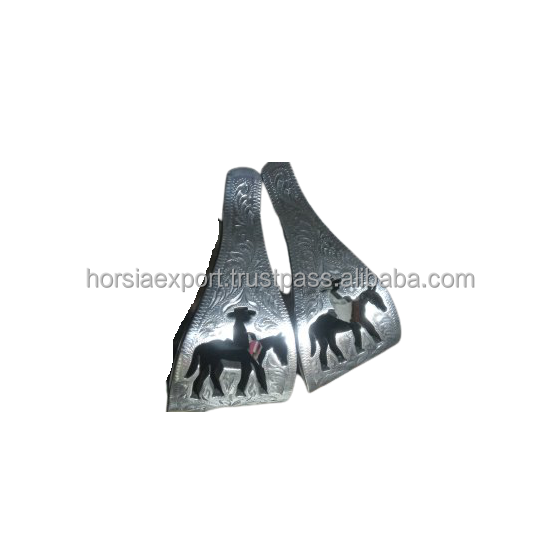 Étrier de cheval en aluminium gravé avec pied de page gainé de cuir et support pour étrier de cheval