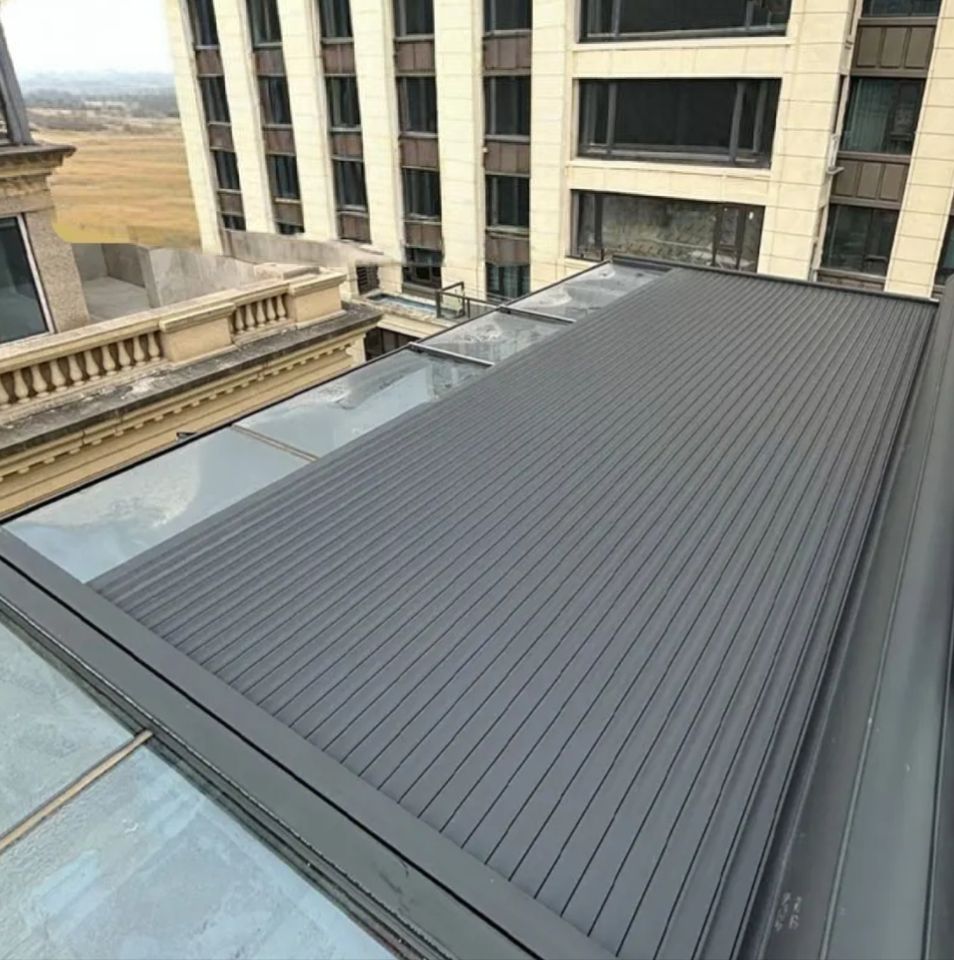 Volets roulants électriques en aluminium pour bâtiments commerciaux et résidentiels, avec cadre en aluminium et stores de toit.