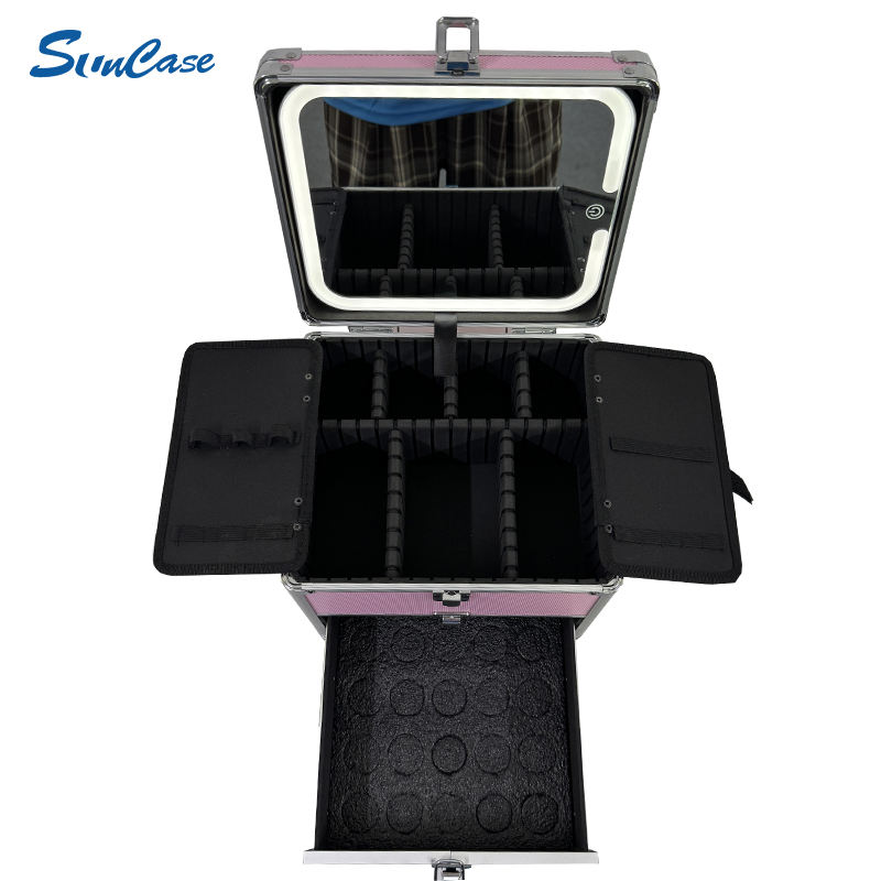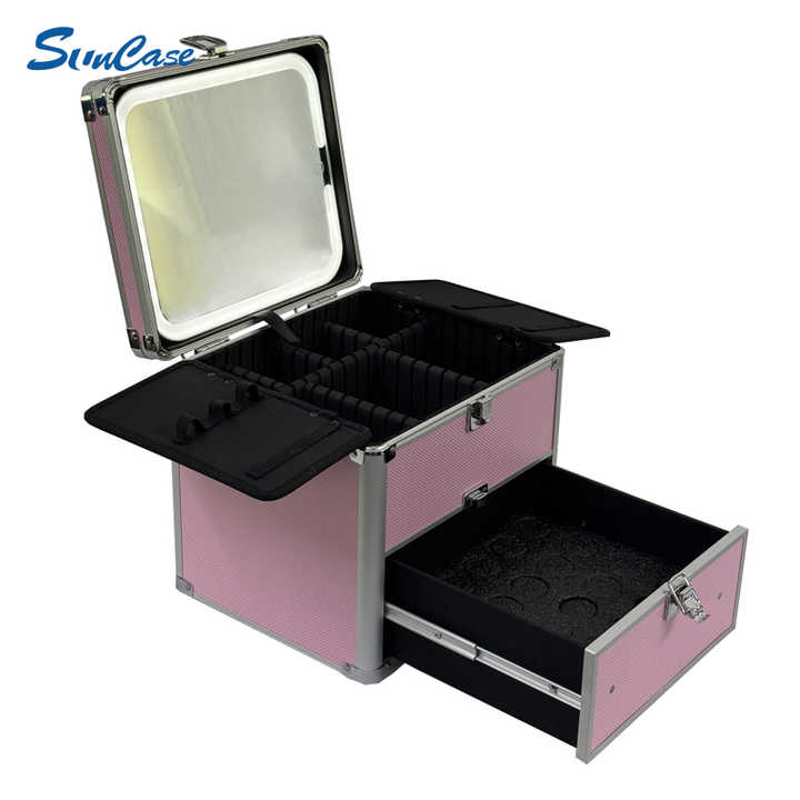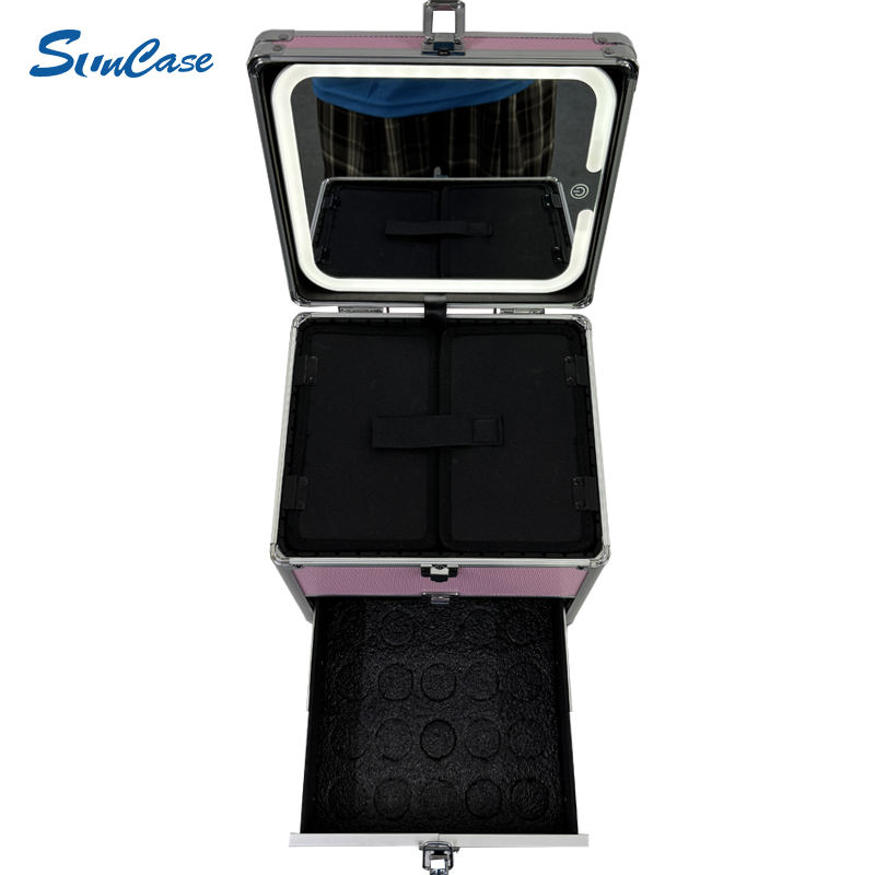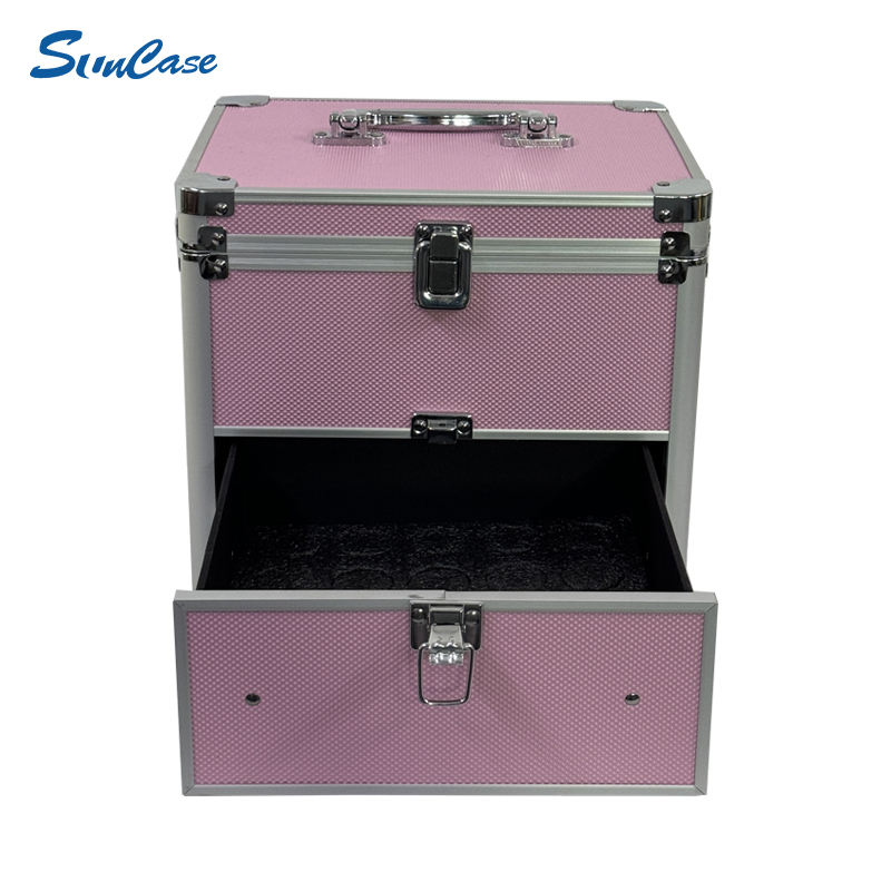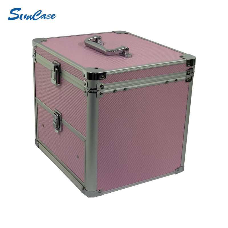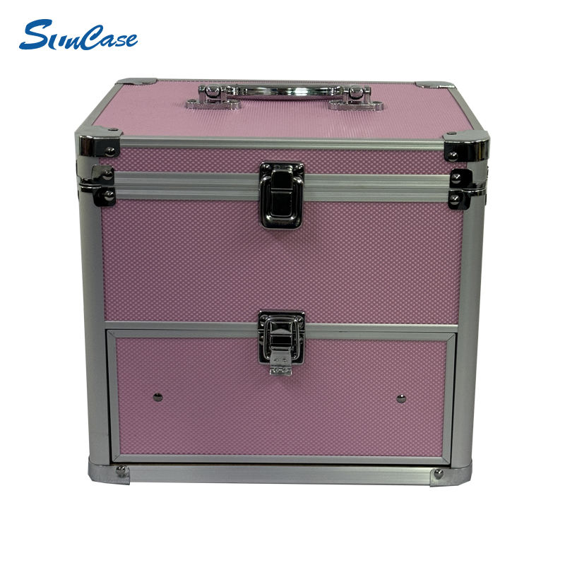 Boîte à maquillage en aluminium avec tiroir Mallette de voyage rose Organisateur cosmétique et valise cosmétique