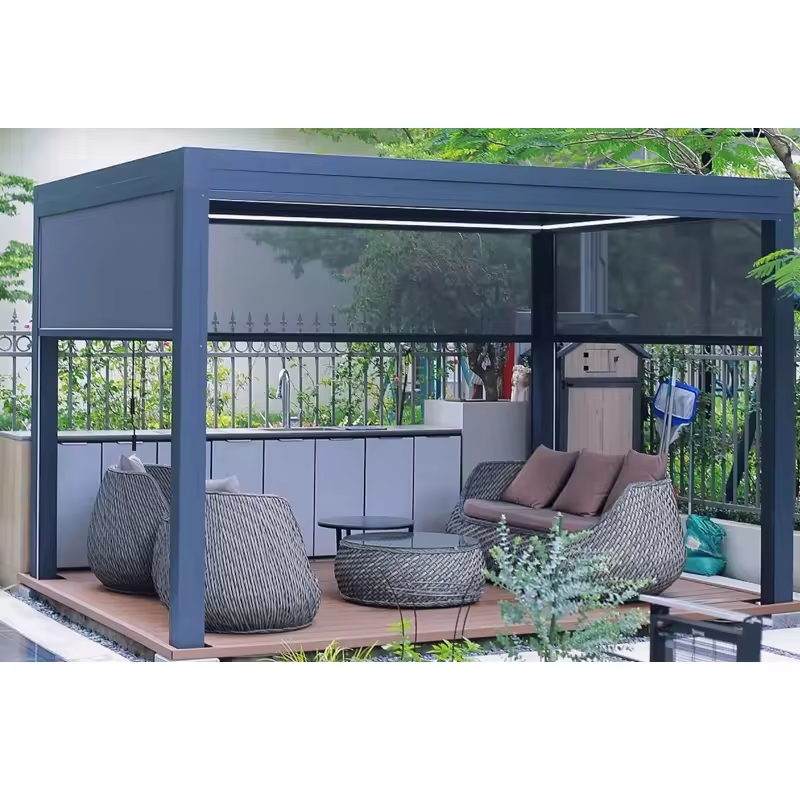 Système de persiennes bioclimatiques en aluminium avec revêtement en poudre imperméable, bâtiments de jardin, pergola extérieure, gazebo, toit carré, balcon, nature