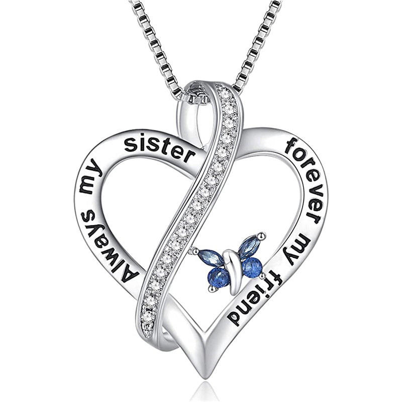 Pendentif Cœur « Toujours ma sœur, toujours ma amie » en alliage de zinc plaqué argent avec zircon bleu, bijou cadeau pour femme