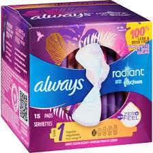 Always Radiant Feminine Pads for Women, Size 4, 60 Count, Overnight Absorbency, With Wings, Scented