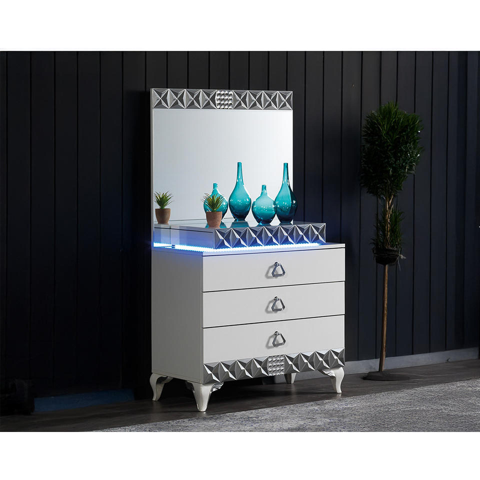 Alyans Modern Design White Silver LED Mirror Dresser with 3 Drawers Diamond Dresser