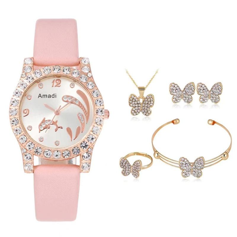 Amadi Montre haut de gamme pour femme Papillon Ensemble cinq pièces Automne Nouveau Décontracté Simple Mode Étudiant Style Exquis Dauphin Quartz