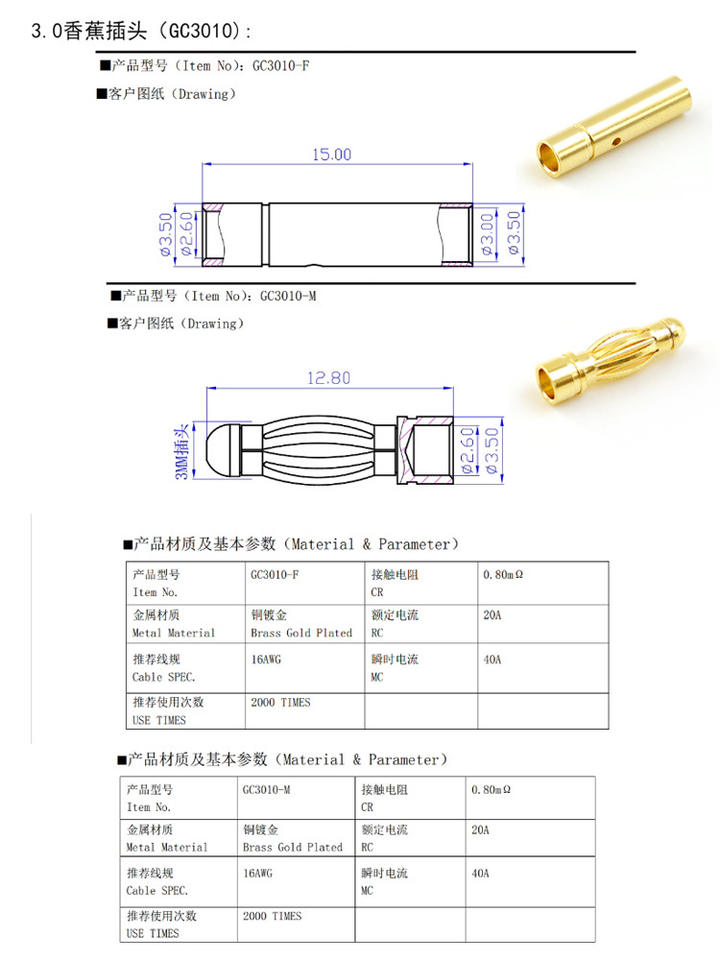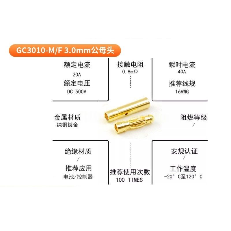 Ensemble de connecteurs à balle en cuivre pur plaqué or Amass GC3010-M GC3010-F 3,0 mm, courant continu 20A pour moteur et ESC RC