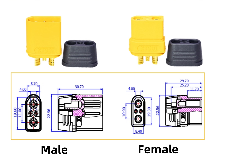 Connecteur en laiton Amass XT90I 4 broches (2 alimentation + 2 signal) 45A à courant élevé pour câbles de signalisation et entrée d'alimentation des batteries de drones