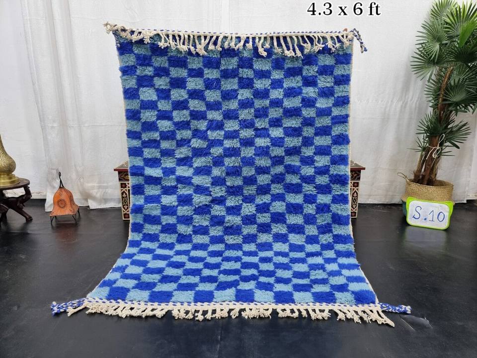 Incroyable Beni Ourain Tapis marocain fait main Tapis bleu clair en laine berbère Tapis à carreaux par des femmes indiennes pour la chambre à coucher