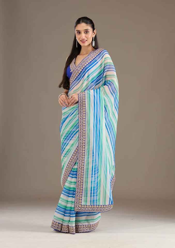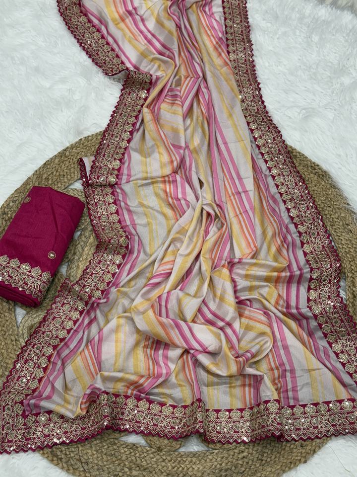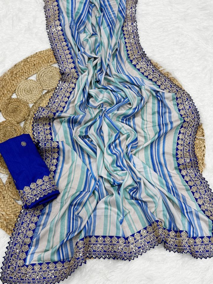 Nom du produit:Sari en soie Chinon incroyable avec impression numérique et bordure Zari à sequins