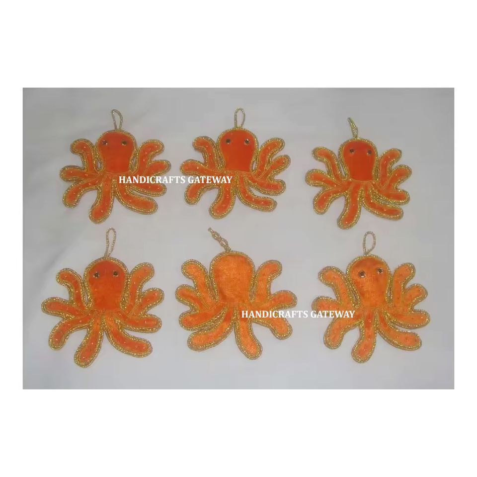 Tissu orange au design étonnant Formes de pieuvre Broderie Zari dorée avec ornements de Noël perlés pour la décoration de la maison