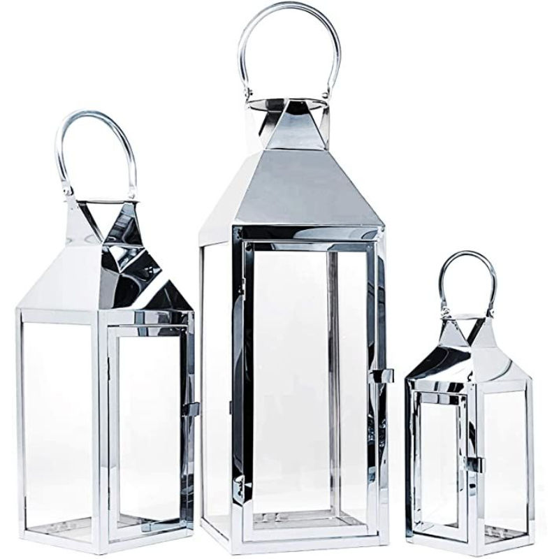 Lanternes à bougies en acier inoxydable et en verre au design incroyable pour la décoration de la maison et de Noël, lanternes de sol argentées brillantes