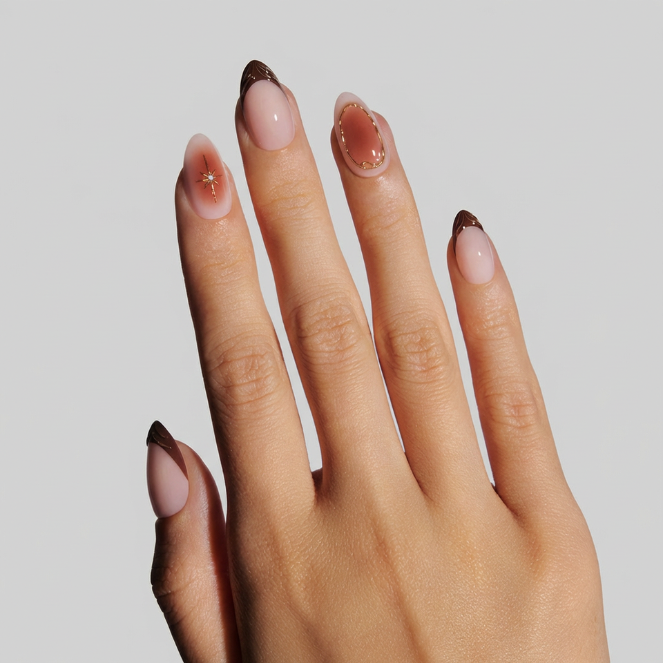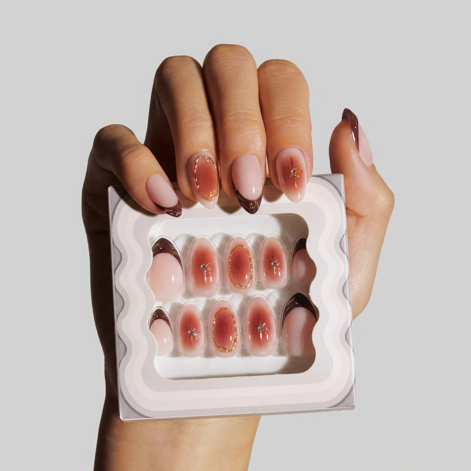 Amber Muse Brown Gold Rhinestone Semi Opaque Glossy Reusable Transparent Case Press on Nails False Nails Artificial Nails