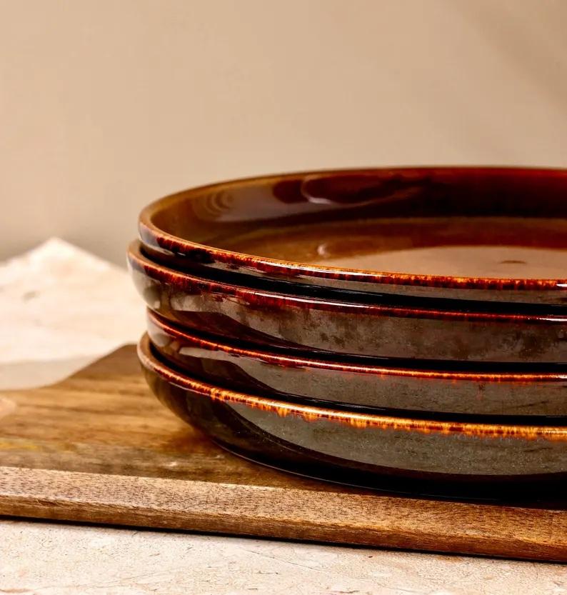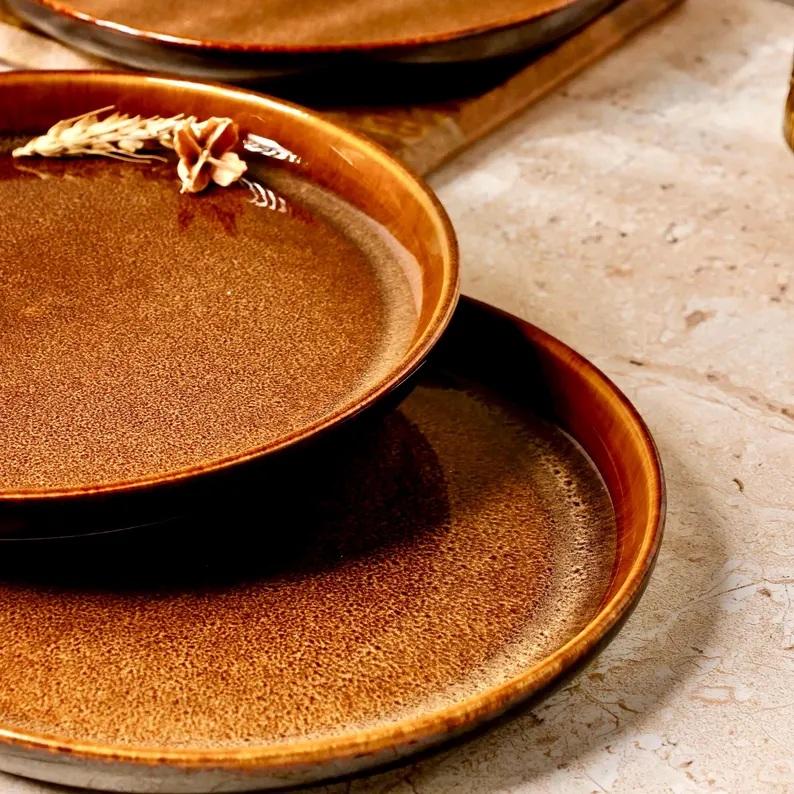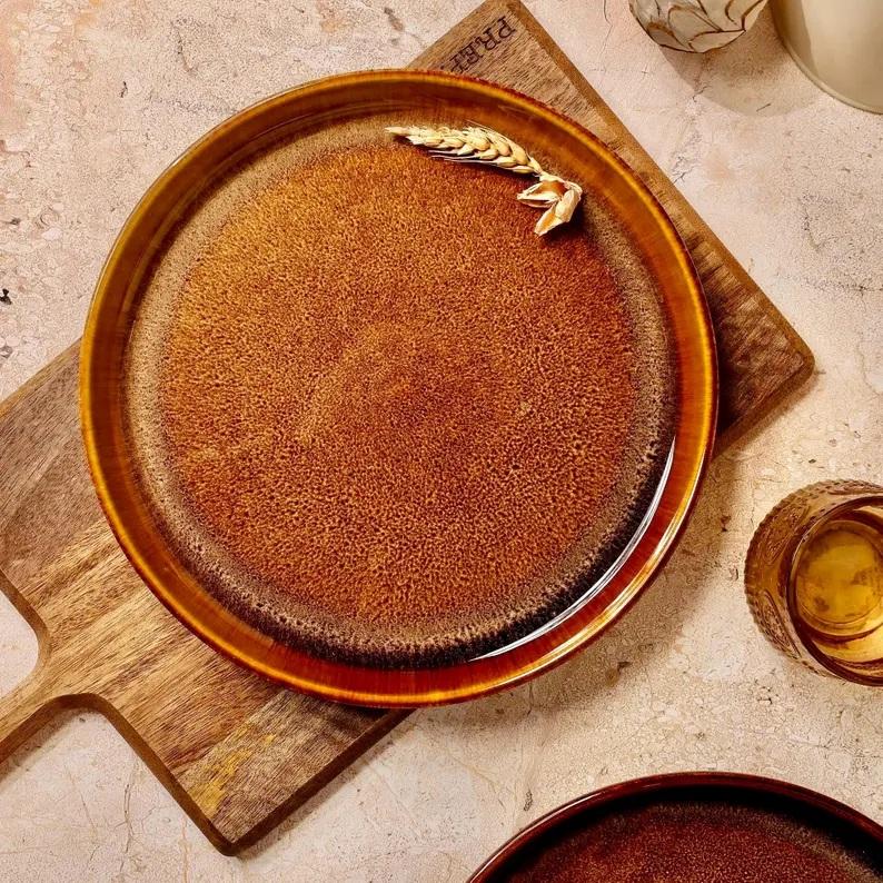Assiette de table en céramique texturée rustique ambre, finition éclat réactif audacieux, teinte terre profonde, choix robuste et durable pour la mise en scène de la table