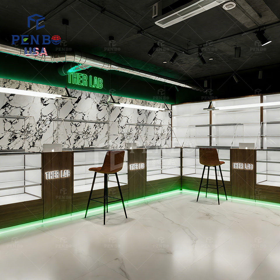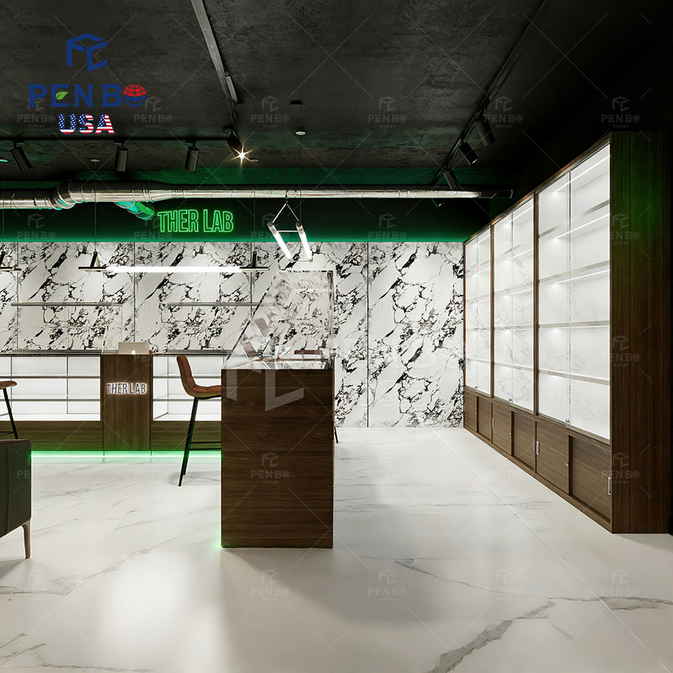 Vitrine d'exposition de style américain pour dispensaire de produits de fumée, en verre personnalisé avec éclairage LED et design écologique