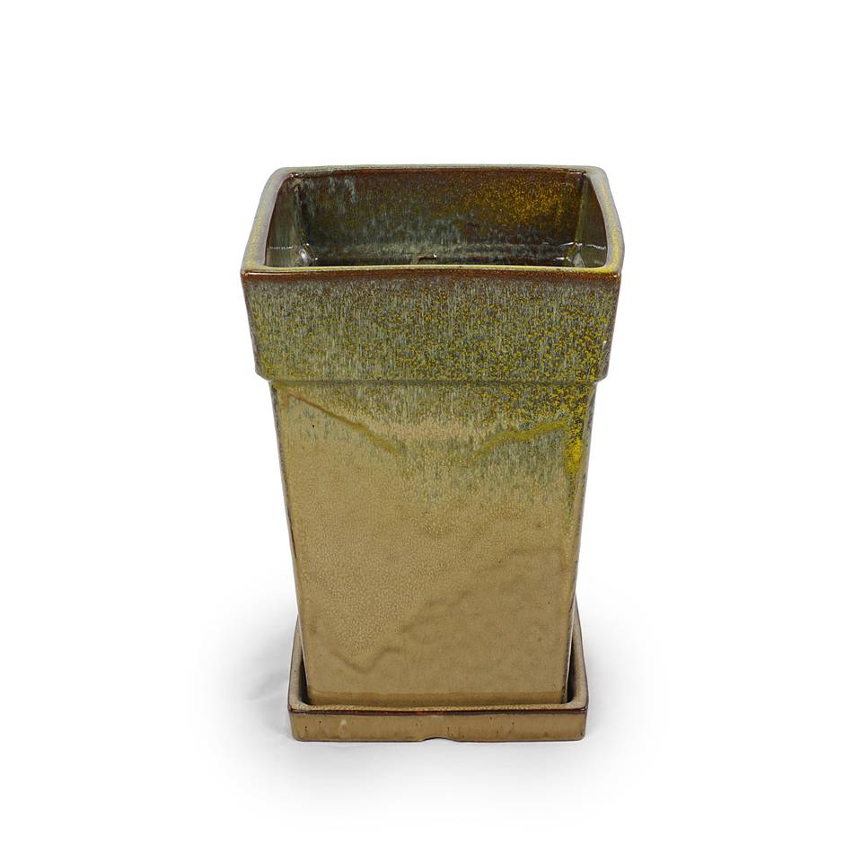 Pot de fleurs en céramique émaillée bicolore de style américain contemporain avec soucoupe, trou de drainage, écologique, durable, vert foncé beige, pour la maison et le jardin