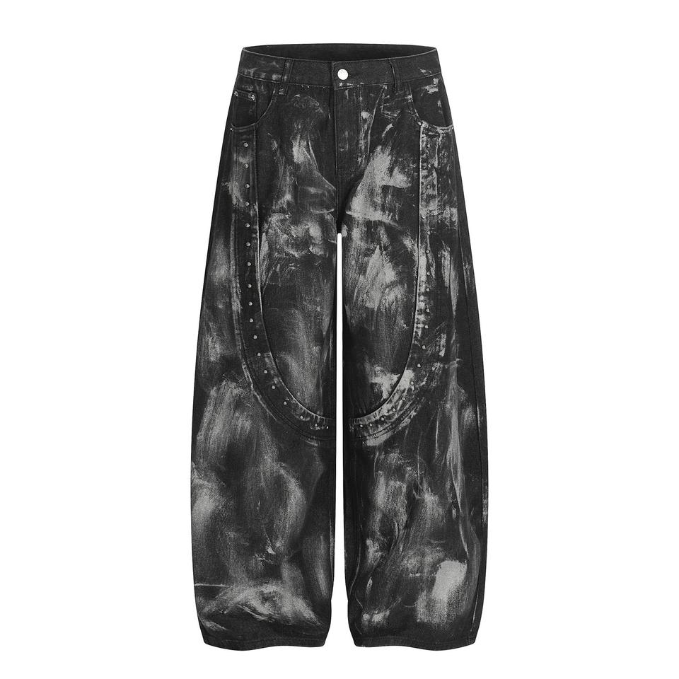 Pantalon Américain Déchiré à Jambes Larges avec Rivets, Effet Peinture Brossée, Personnalisé, Décontracté, Vintage, Rétro, Coupe Droite