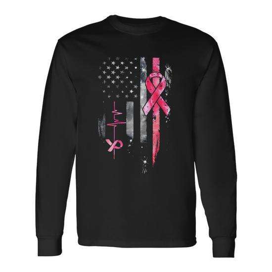 T-shirt à manches longues avec drapeau américain et ruban rose pour la sensibilisation au cancer du sein