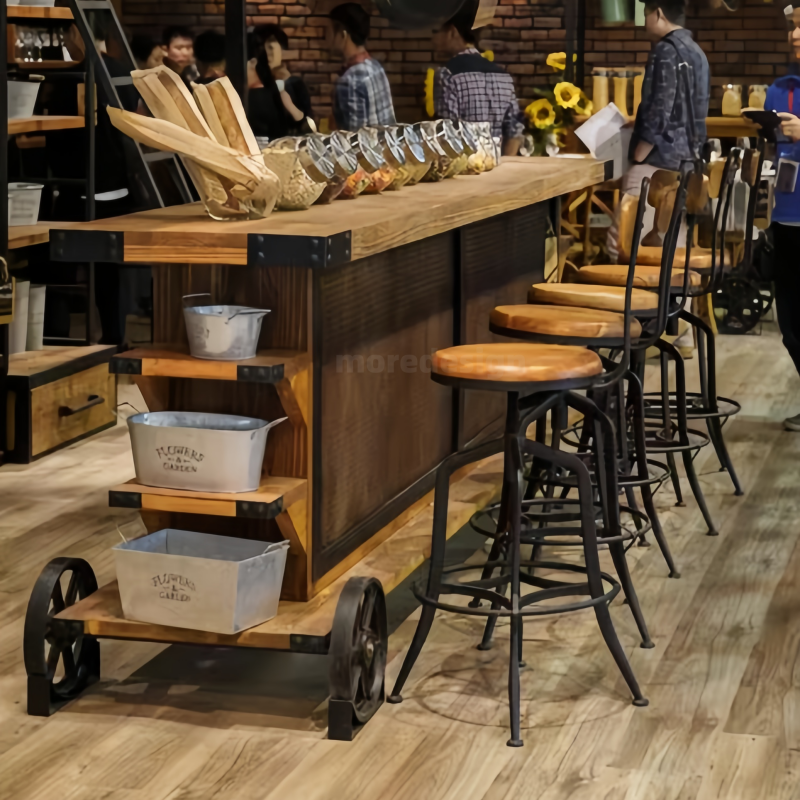Comptoir de bar en bois massif de style industriel américain pour restaurant commercial, avec rangement et compartiment de caisse