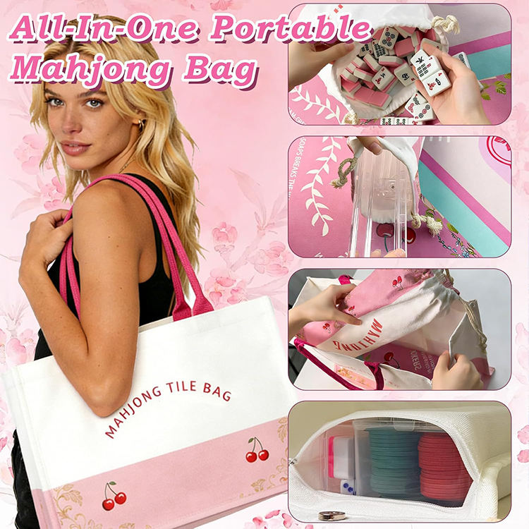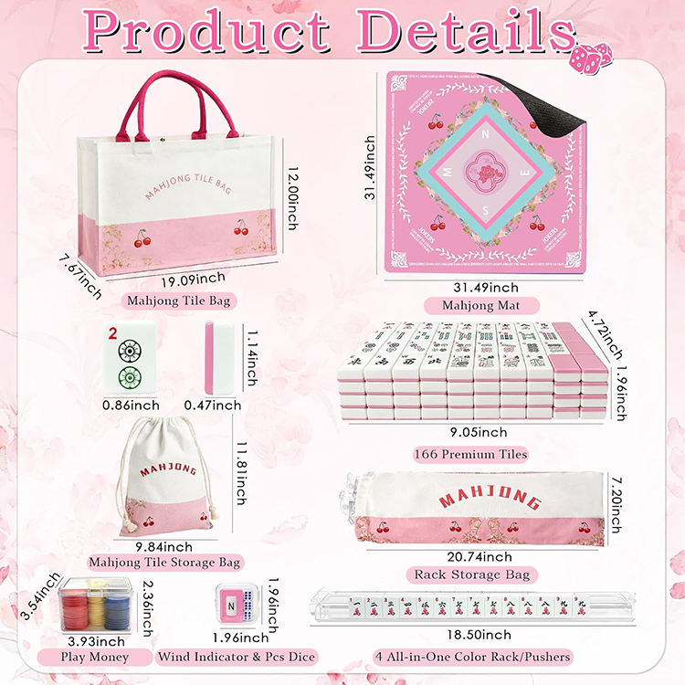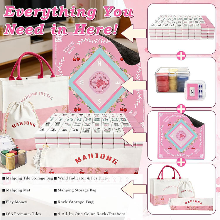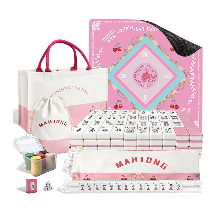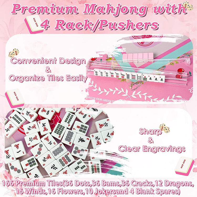 Jeu de tuiles de mahjong de luxe américain, tapis, 166 tuiles roses, sacs portables, support/poussoirs 4 pièces - Jeu de casino pour adultes débutants