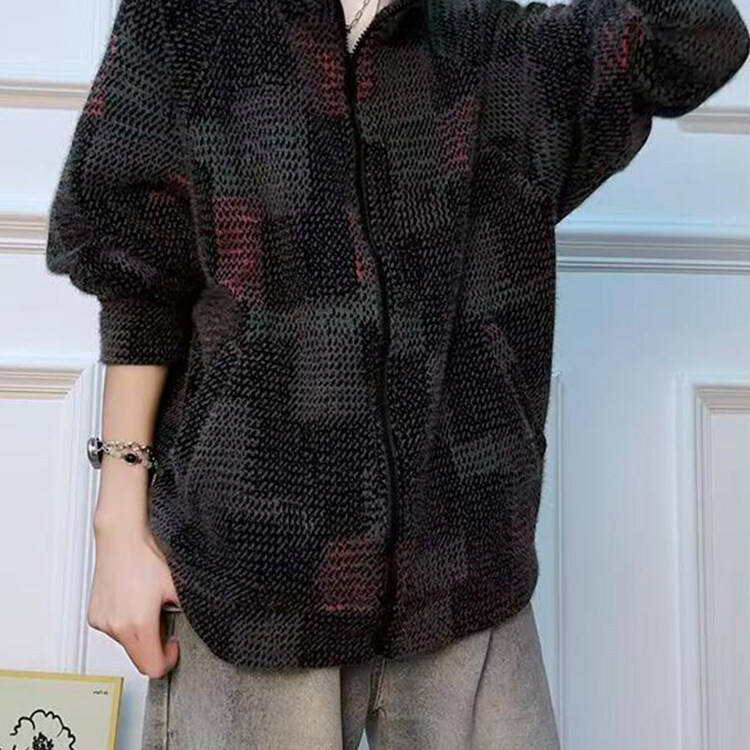 Cardigan en molleton tricoté style rétro américain, sans capuche, col montant, à carreaux colorés, pour automne-hiver, streetwear