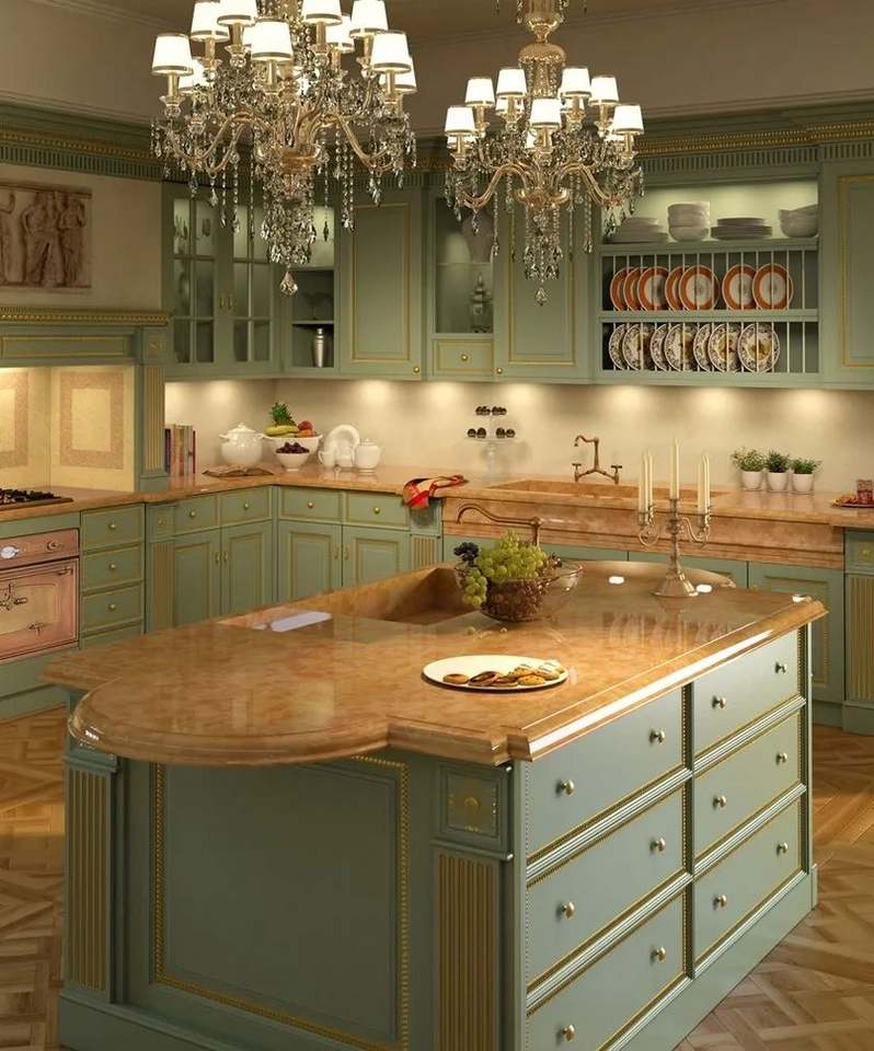 Armoires américaines rétro peintes en vert, îlot de cuisine en marbre rouge, plan de travail personnalisé avec fonctionnalité