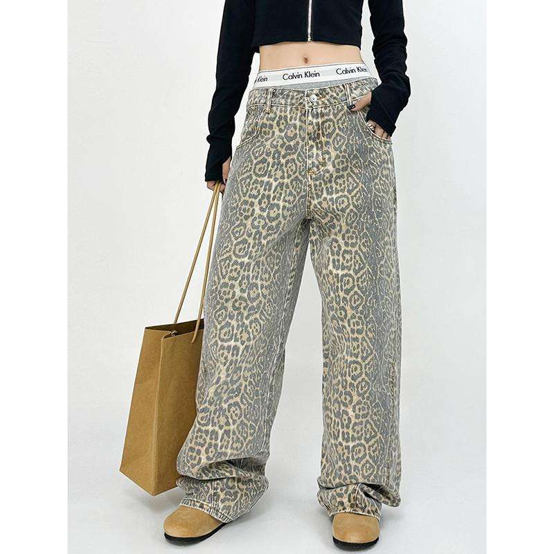 American Retro High Street Casual Overalls Leopard Print Loose Wide Leg Leg Pants For Women Y2k Hip-hop Cargo Grunge Baggy Trousers