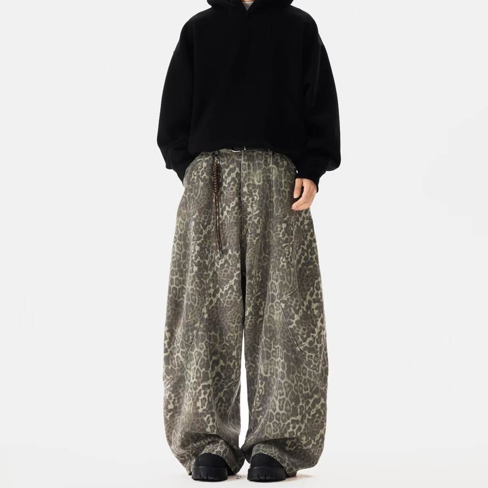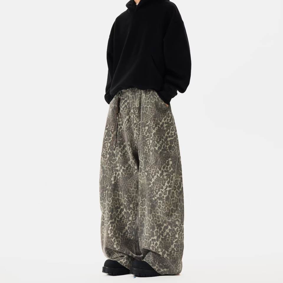 Pantalon large à imprimé léopard rétro américain, style scimitar, printemps automne, décontracté, ample, jambe droite, cool, vêtements de travail, jeans