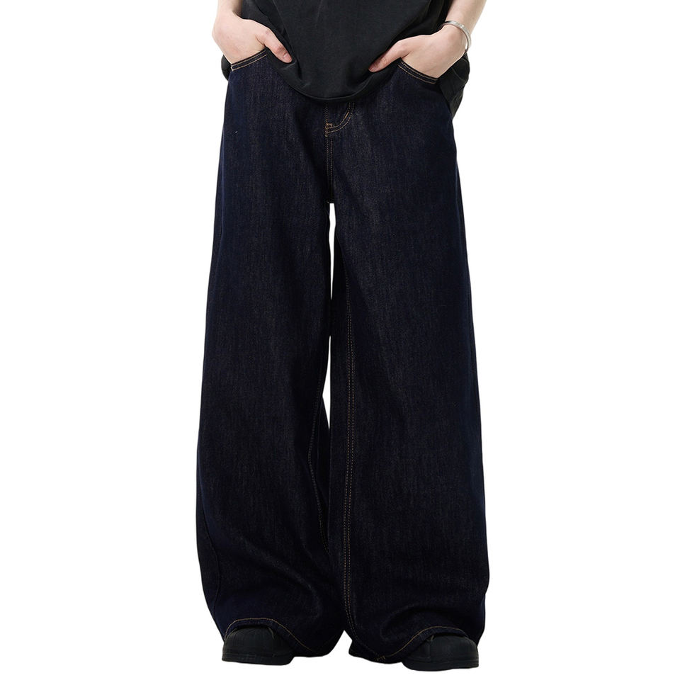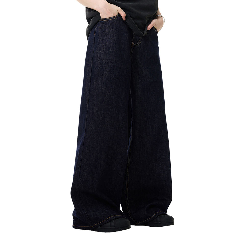Jean en denim de coton bleu rétro simple style américain, coupe droite, taille mi-haute, unisexe, ample, délavé, respirant, écologique, pour l'hiver