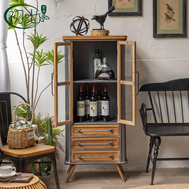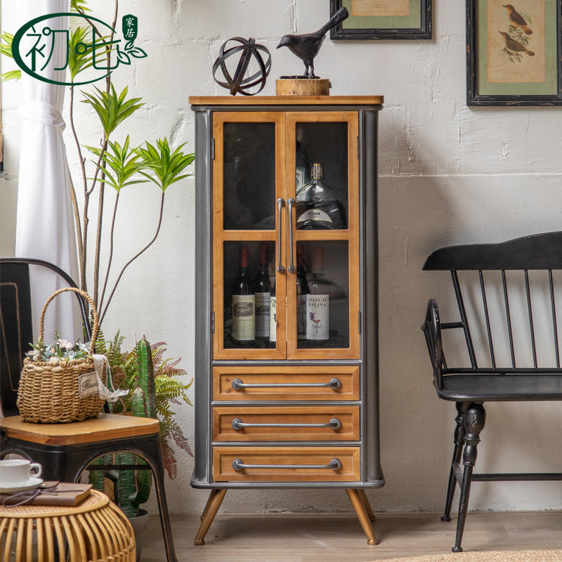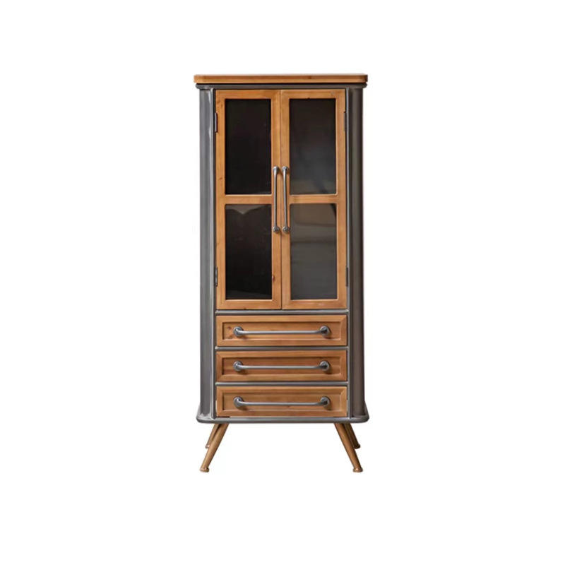 Vitrine rétro en bois massif de style américain à double porte avec portes et tiroirs en verre pour le rangement dans le salon