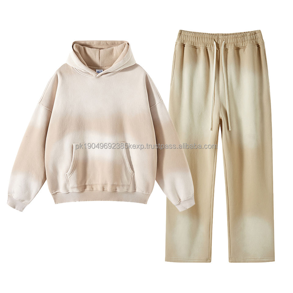 American Style Winter Streetwear Thick Cotton Sun Faded Vintage Spray Dyeing Hoodies and Sweatpants Set for Men Boys Unisex
