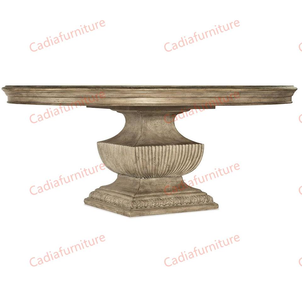 Table à manger ronde de style vintage américain, structure en bois massif, table à manger classique sculptée avec 6 chaises en tissu