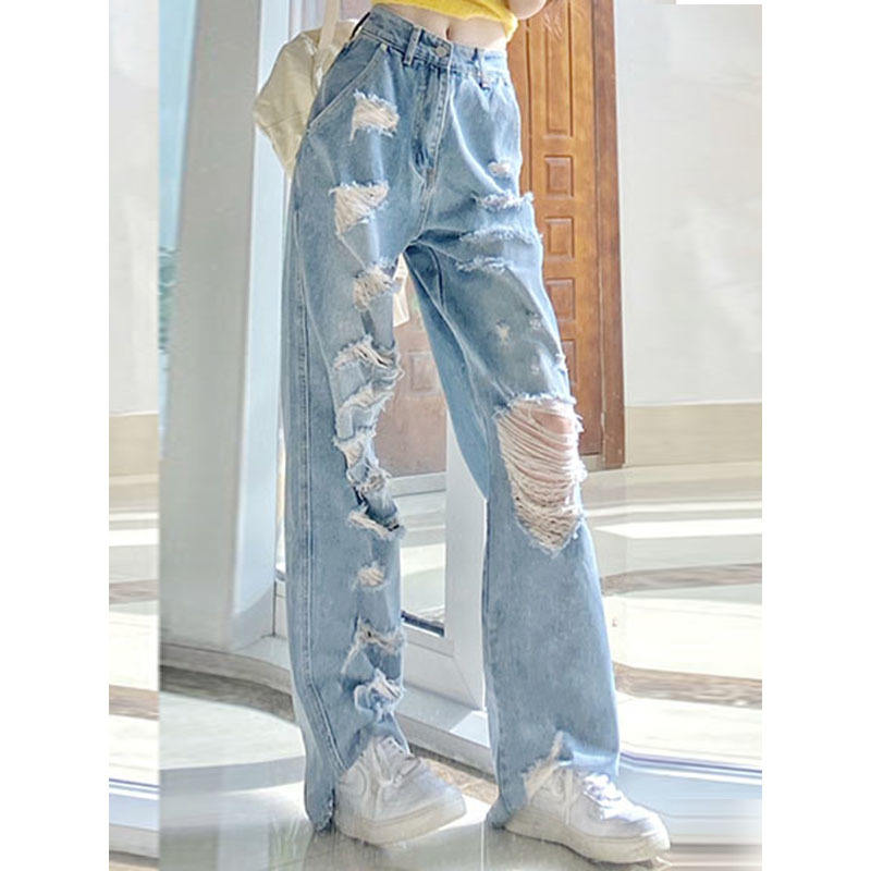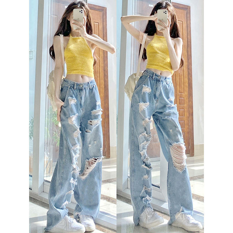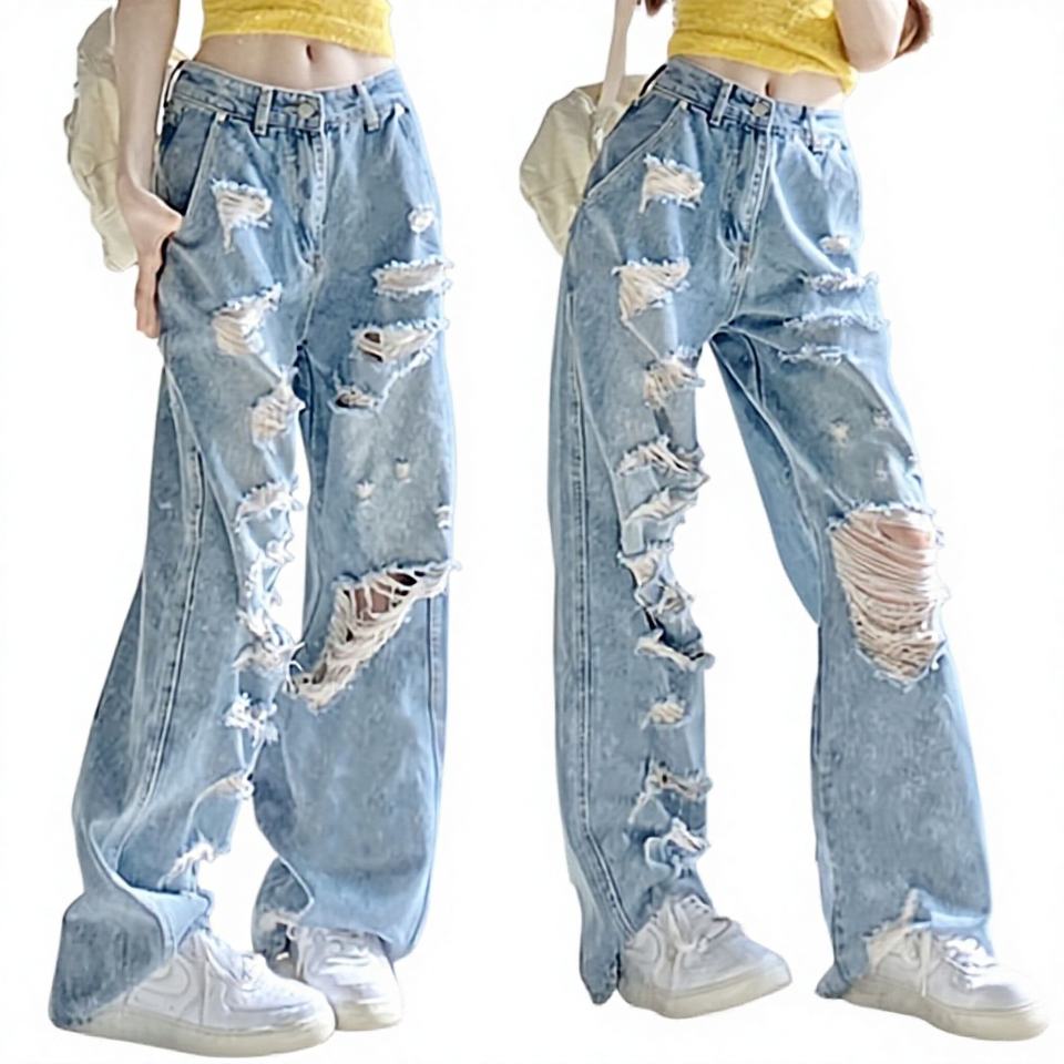 Pantalon en jean déchiré style américain pour femme, coupe droite, taille haute, ample, amincissant, séchage rapide, design tendance pour l'été
