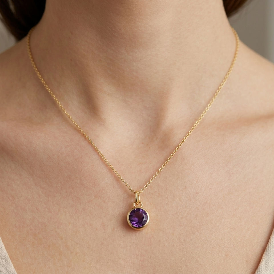 Pendentif plaqué or avec améthyste et lunette en argent pour le mois de février