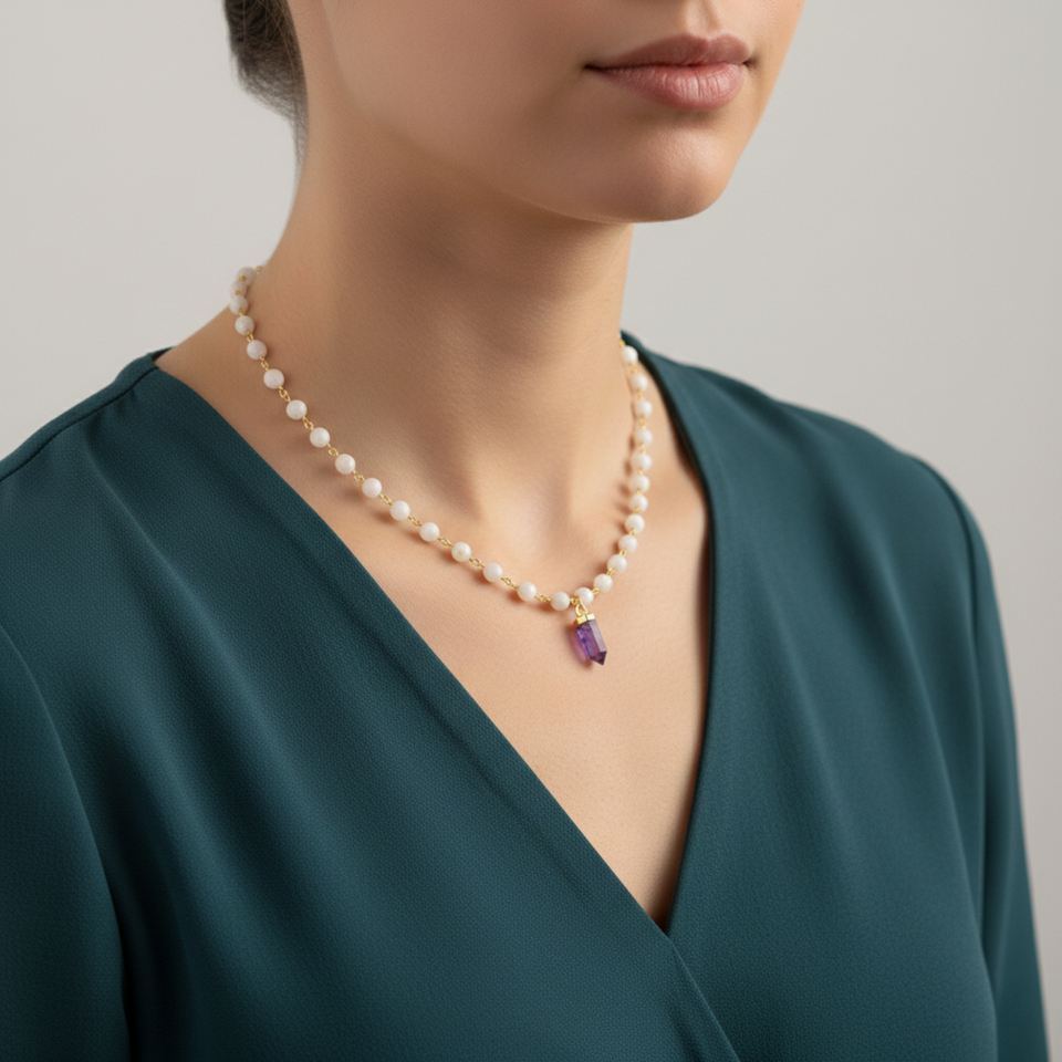 Nom du produit:Collier chapelet en agate blanche en forme de pointe d'améthyste plaqué or