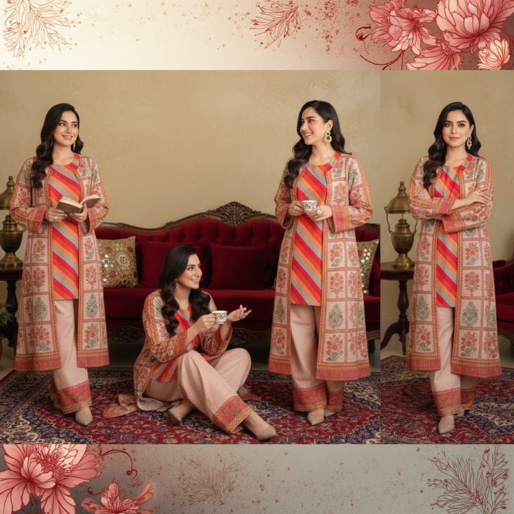 Product Name:Long Coat with Striped Kurta & Pants