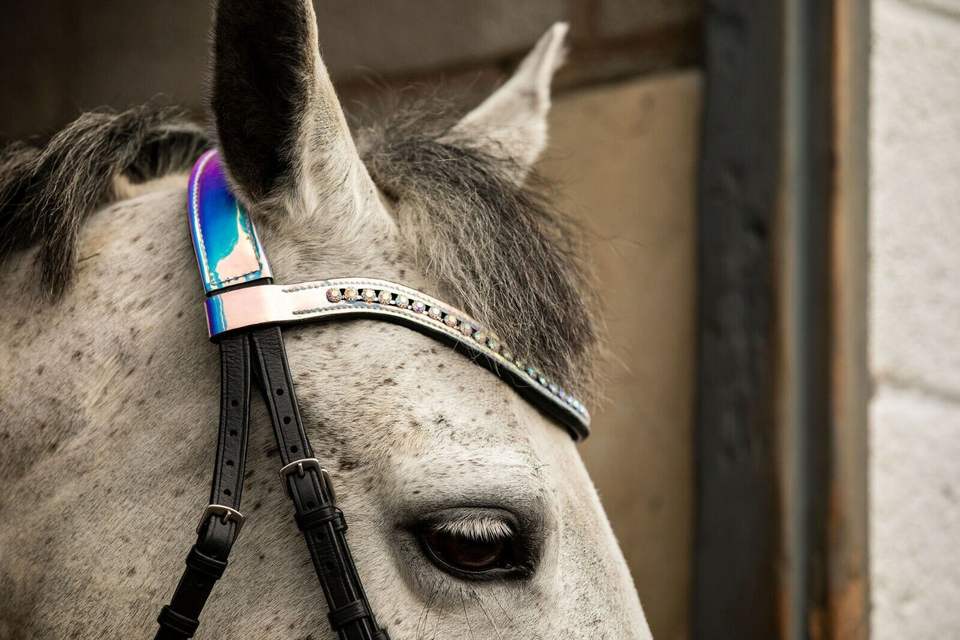 Anatomical Grackle Bridle & Reins - Full Brown Anatomical Headpiece Bridle FREEWAY Shimmer Crystal BLING JET GREY