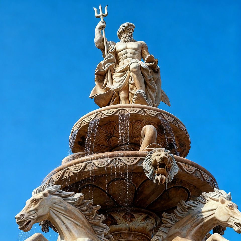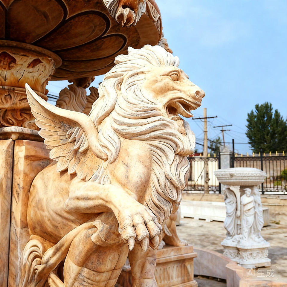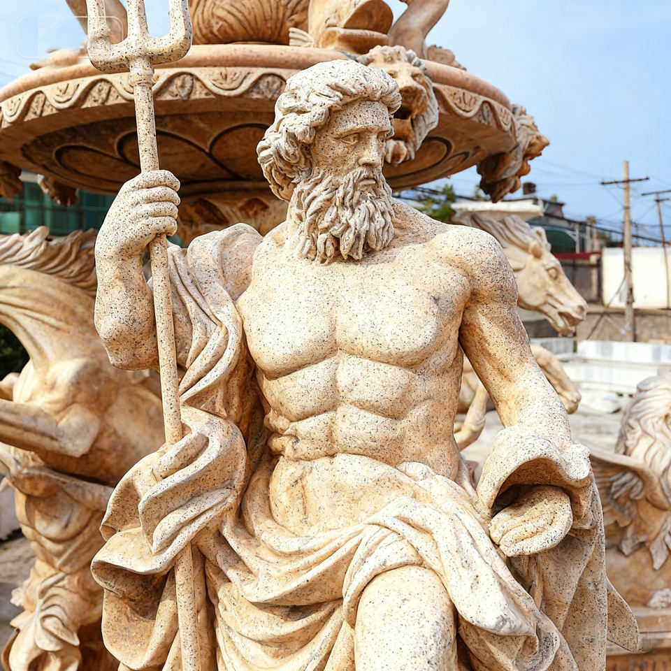 Fontaine d'eau ancienne européenne en marbre beige de grande taille, sculptée à la main, avec des sculptures d'animaux, d'hommes et de chevaux