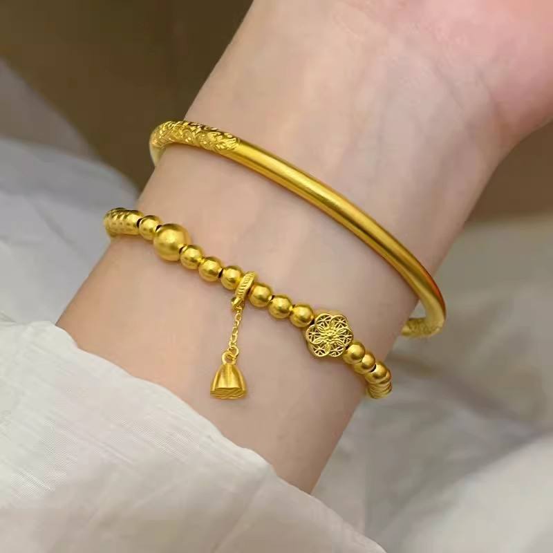 Bracelet Ancien Motif Tangcao Mots Porte-Bonheur Solide à Boucle Fermée Cercle Fin Jaune Jumeau pour Femme