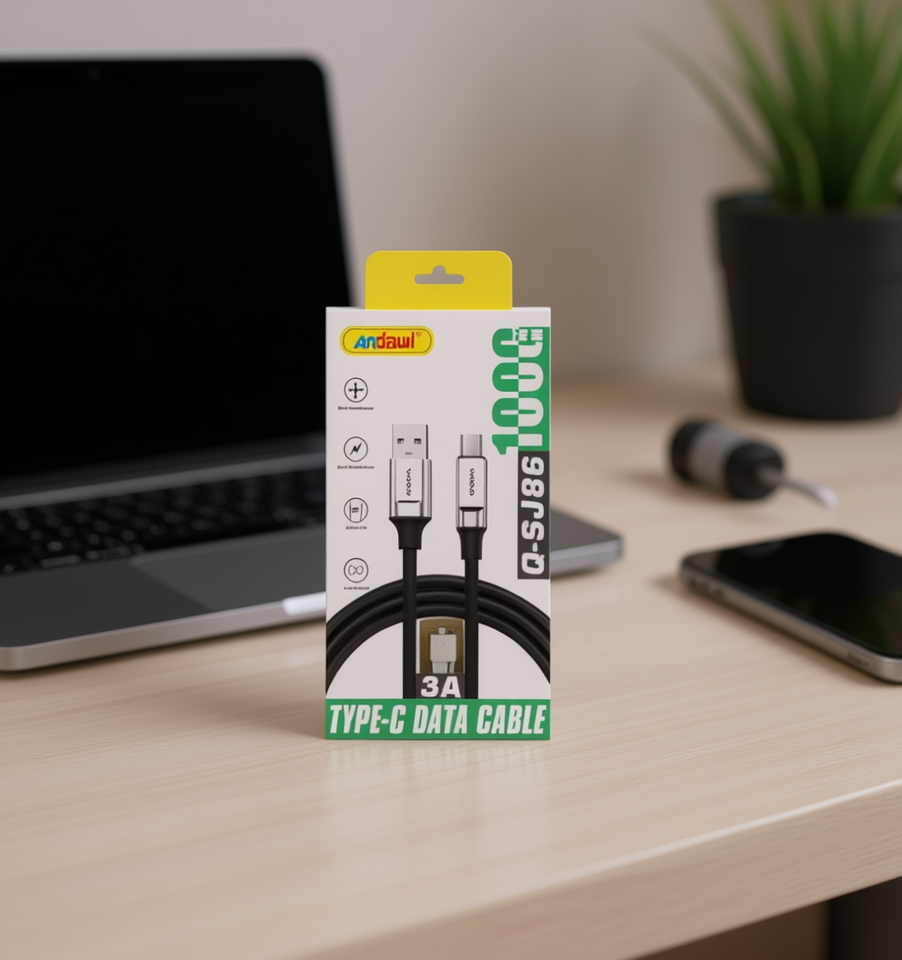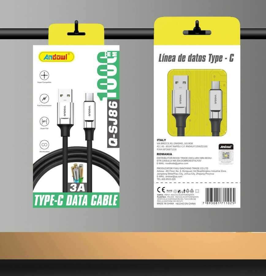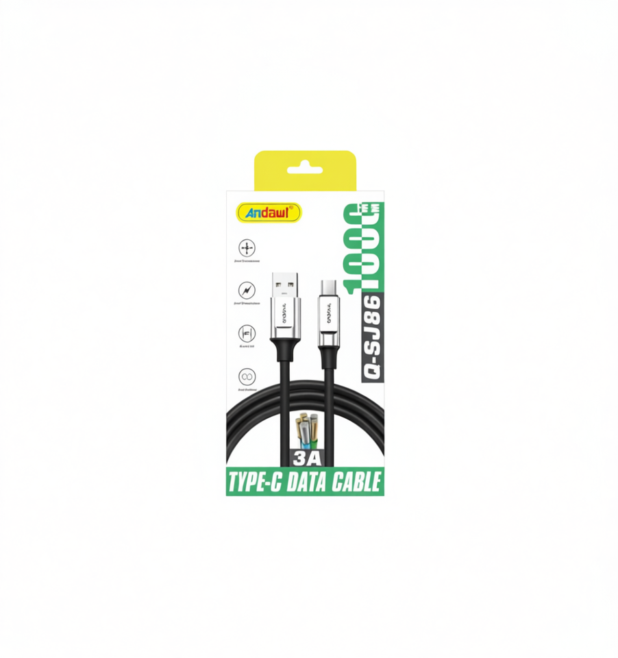Câble de données Type-C Andawl 3A à charge rapide, conducteur en cuivre pur, gaine en PVC blindée pour téléphone portable Q-SJ86