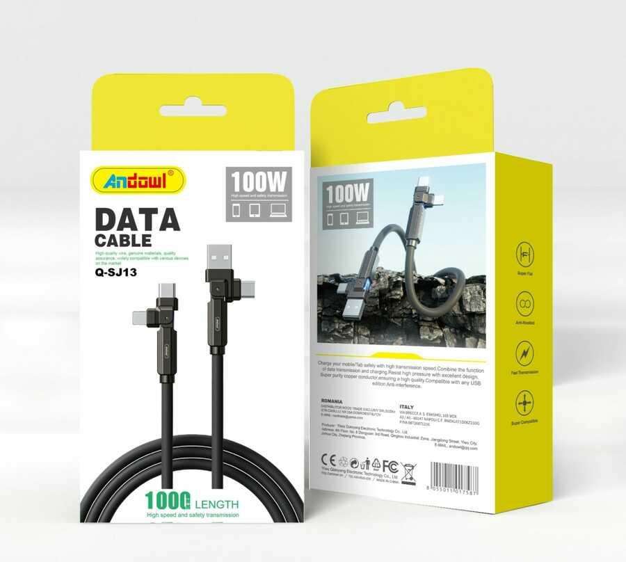 Câble de données Andowl Q-SJ13 Type-C 100W, transmission haute vitesse sécurisée, angle droit, blindage TPE, cuivre pur