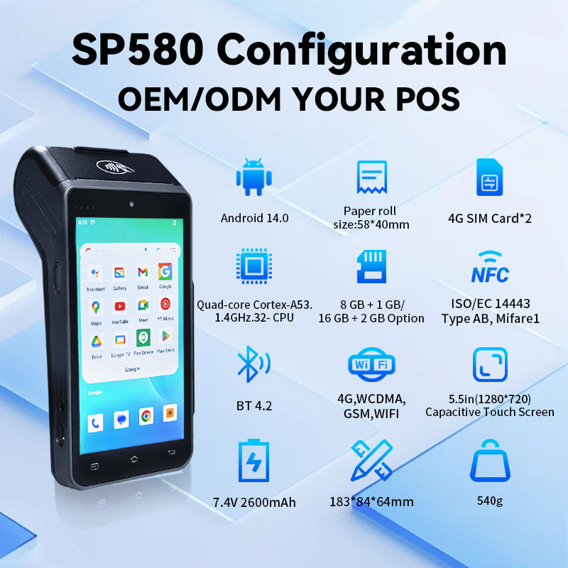 Android 14.0 4G WIFI Terminal de point de vente portable Machine commerciale Carte bancaire Swipe avec NFC Bluetooth Connectivité Comprend Imprimante