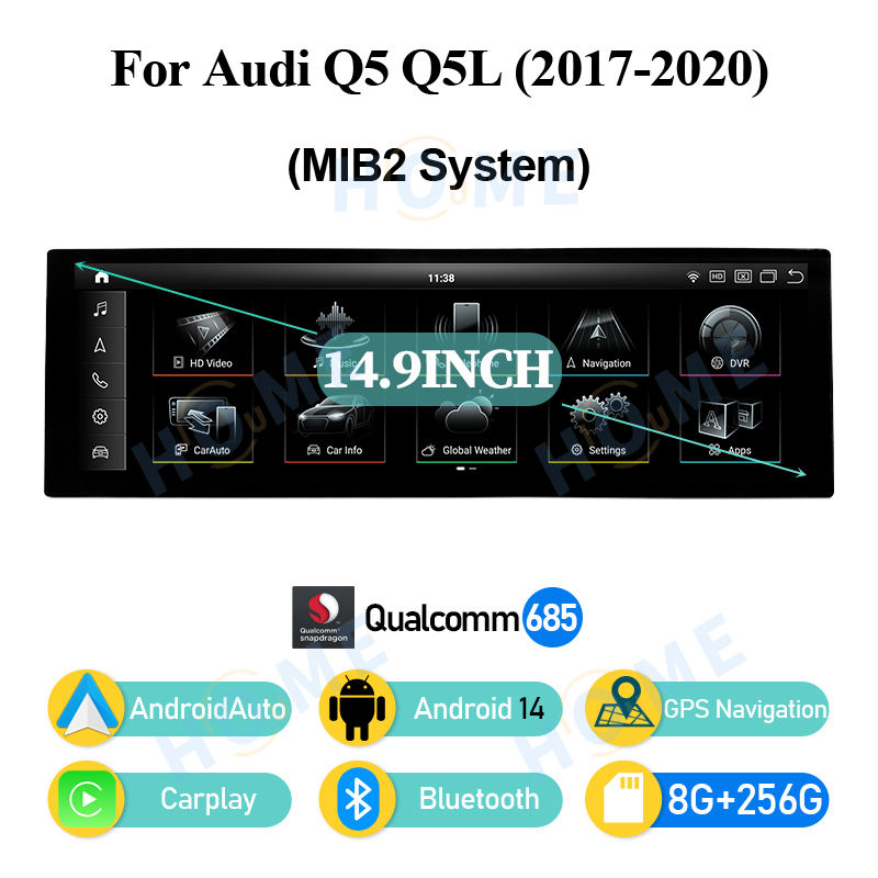 Lecteurs vidéo pour voiture Android 14, Carplay pour AUDI Q5 Q5L 2017-2020, lecteur multimédia Androidauto 14,9 pouces, navigation GPS, écran intelligent