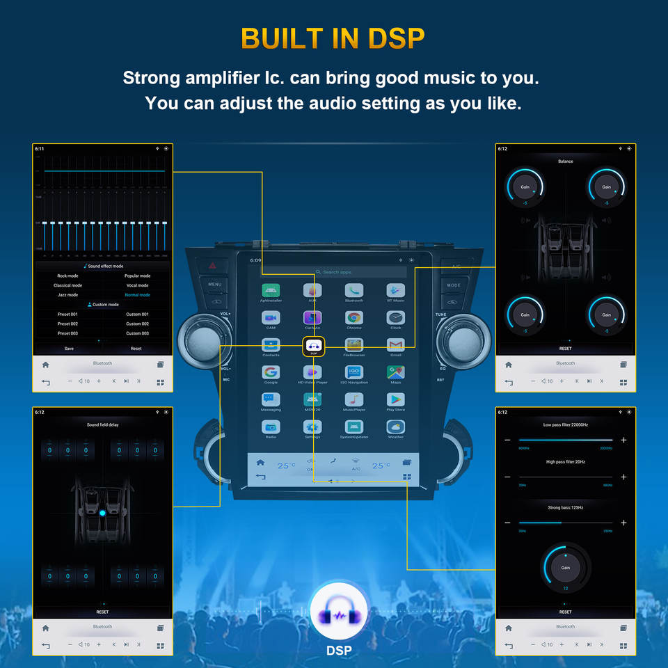 Stéréo, SANS MAINS, GPS, Amplificateur, DSP, CarPlay, Lien de miroir, Android auto, Image dans l'image, Microphone intégré, Écran partagé, Gestionnaire de fichiers, Volant de voiture de Contrôle, Haut-parleur intégréFonction