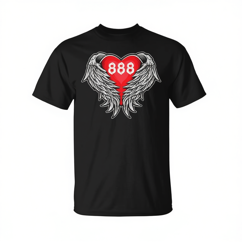T-shirt promotionnel noir pour hommes avec motif cœur et ailes, numéro ange 888