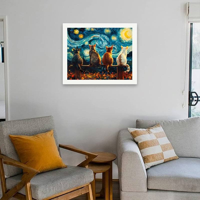 Kit de peinture d'animaux par numéros pour adultes-DIY Chats assis dans une rangée sous le ciel étoilé 16x20 pouces, Cadeaux d'art sans cadre