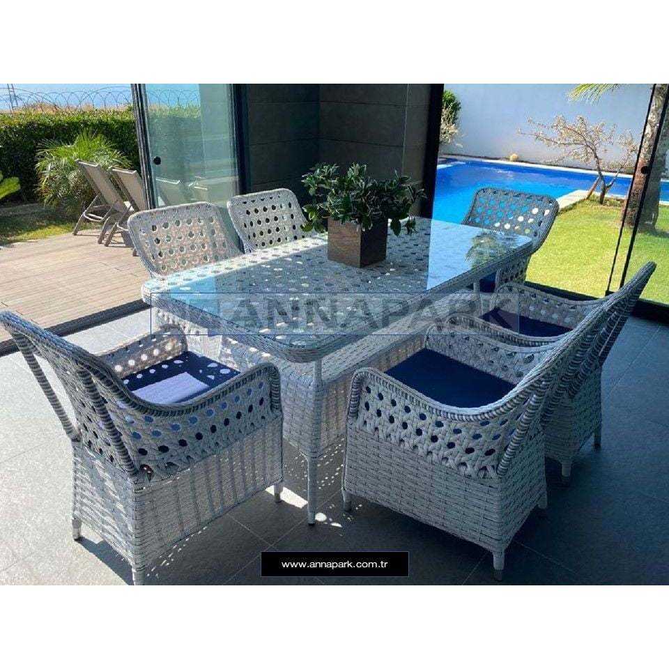 Annapark-Ensemble de table à manger en rotin gris clair/bleu pour six personnes, mobilier de jardin extérieur