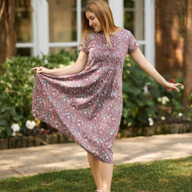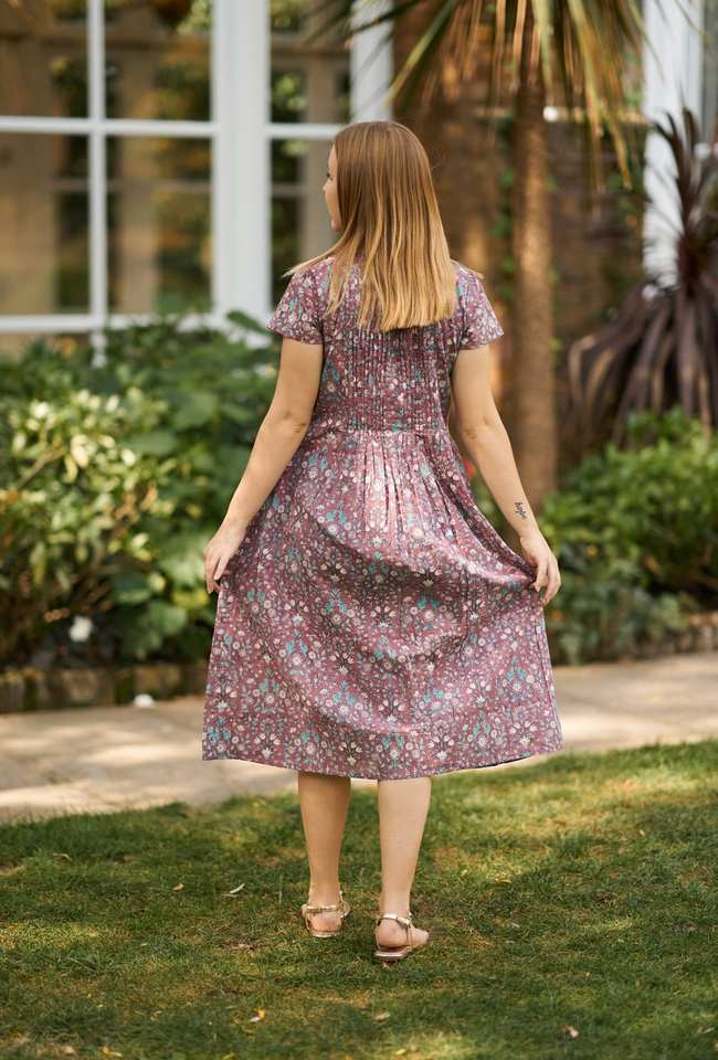 Anne Bohemian Pure Cotton Dress Hand Block Printed Floral Brown Blue Ethical Fashion