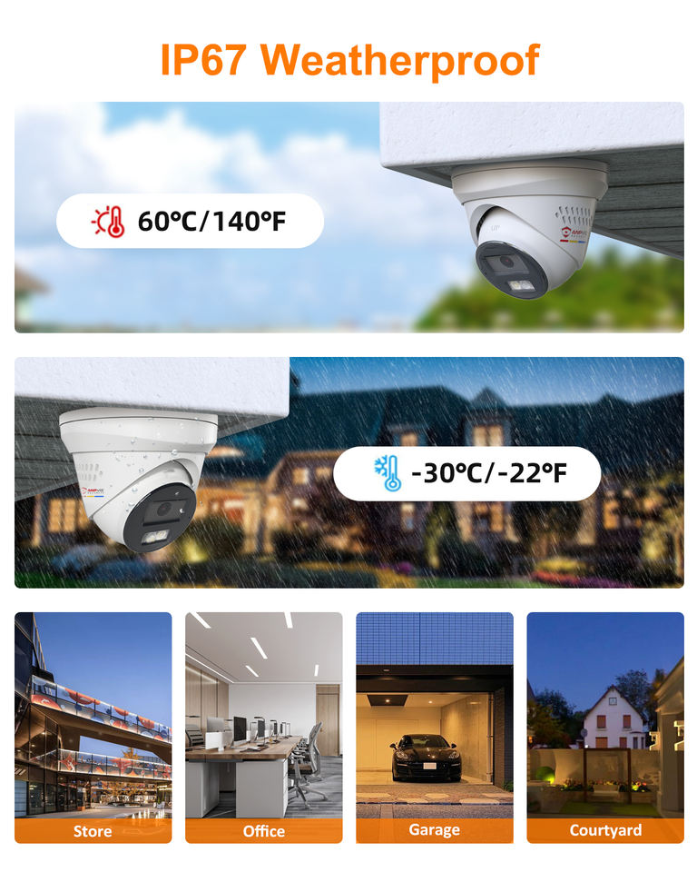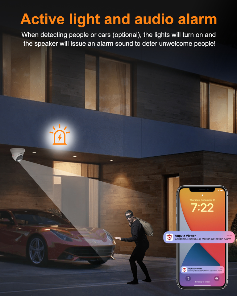 Caméra IP tourelle Anpviz 5MP, dissuasion active US Stovk, audio bidirectionnel, vision nocturne couleur, 100 pieds, IP67, entièrement métallique, extérieur