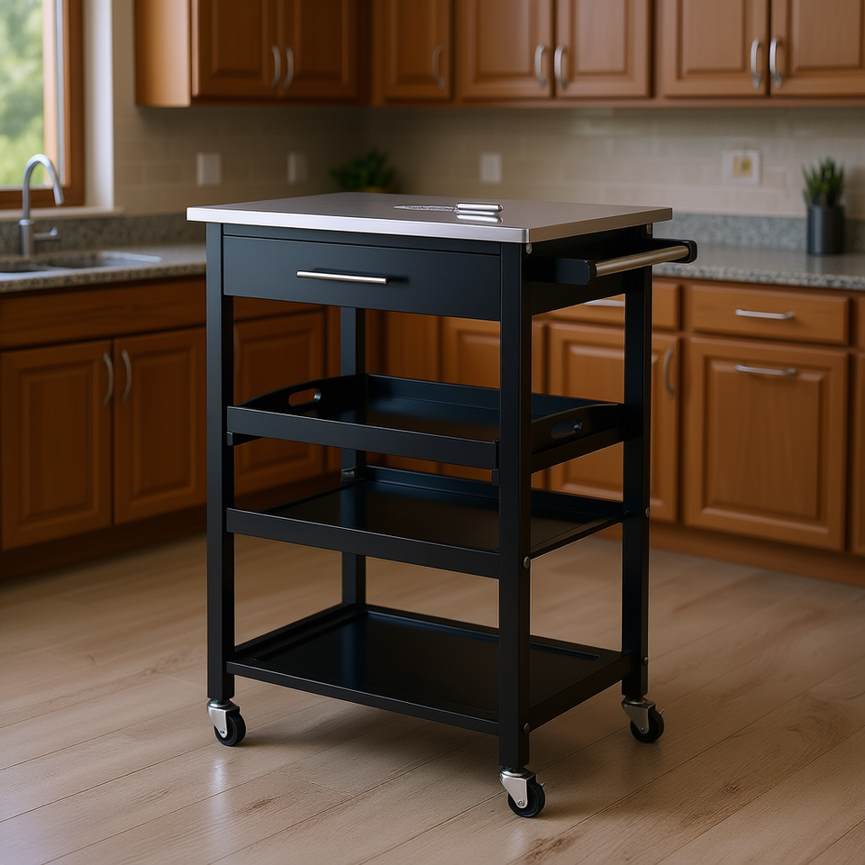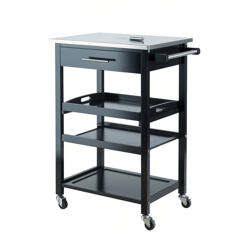 Chariot de cuisine Anthony en acier inoxydable, 1 tiroir, 3 étagères, design moderne et durable